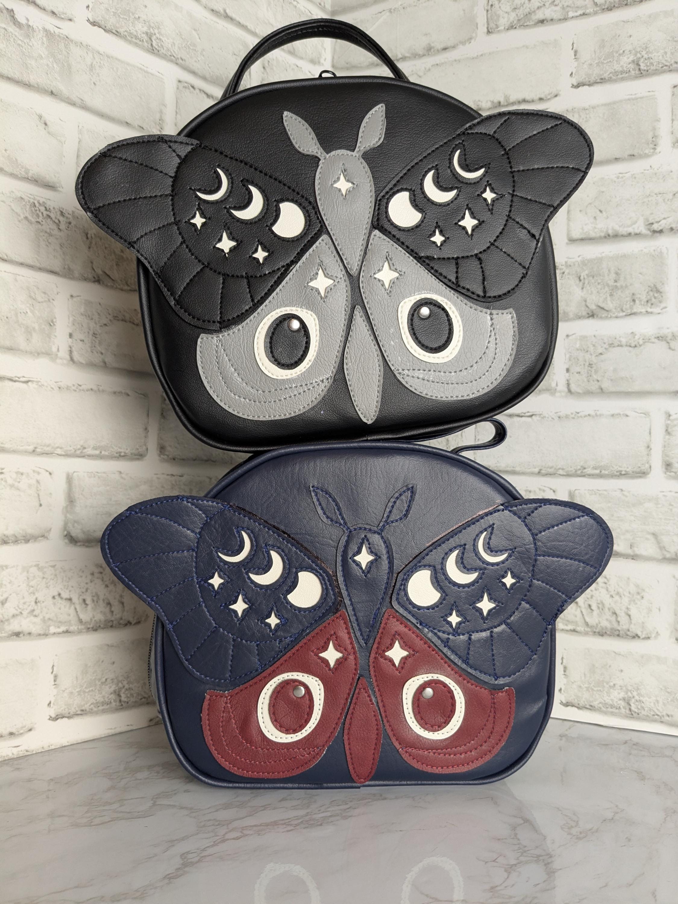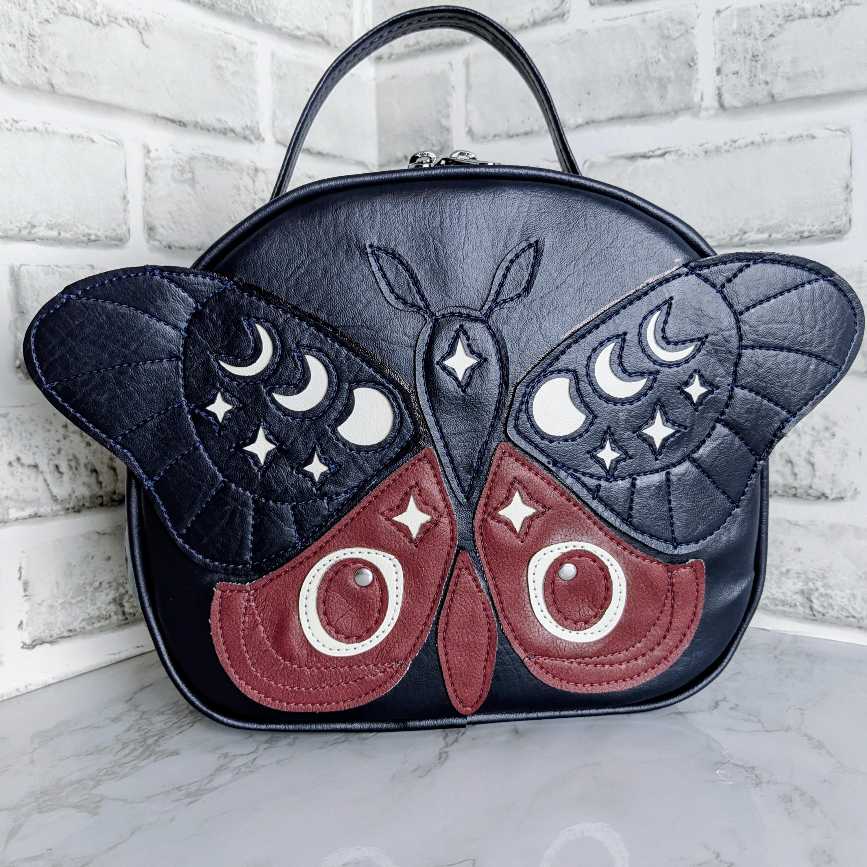 Unleash your inner moonchild with the Luna Moth Handbag, a spellbinding accessory that captures the mystique of the night. Crafted from premium vegan leather, this statement piece features an intricate appliqué of a luna moth, symbolizing feminine energy, transformation, intuition, and quiet strength. The wings boast celestial details — crescent moons and twinkling stars — in striking blue, burgundy, and white tones, making it a dreamy addition to any wardrobe.
